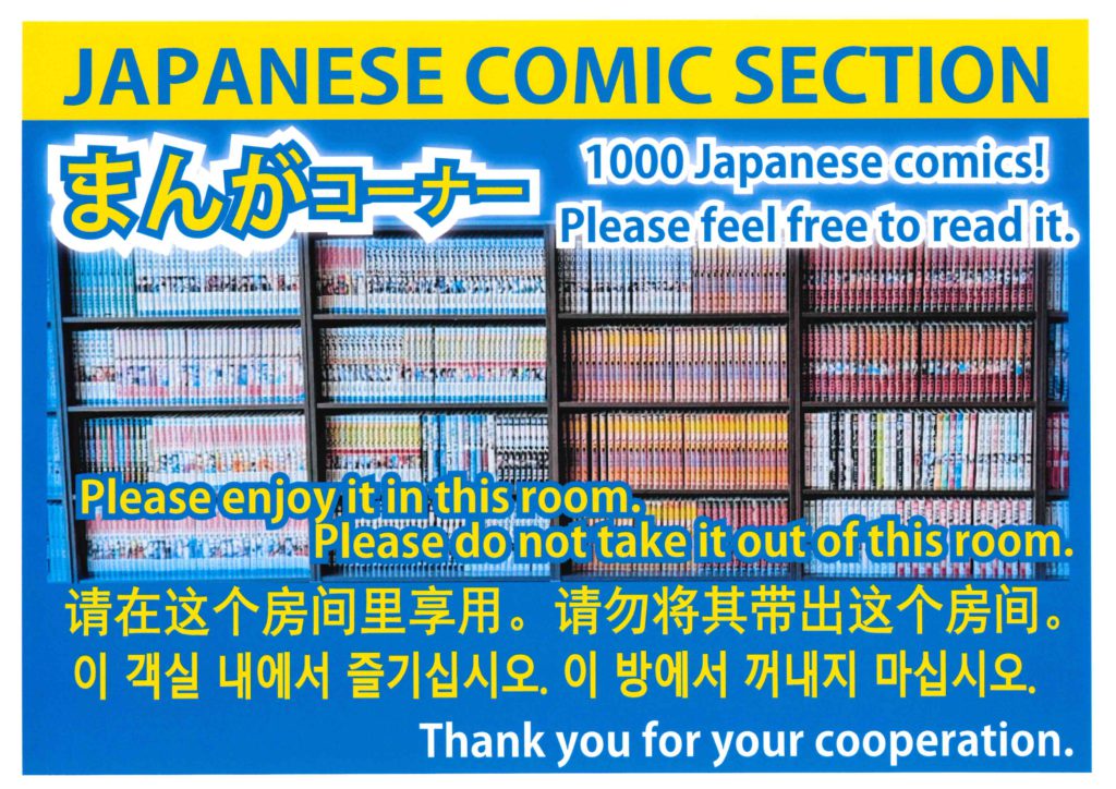 支配人様より「コミックは休憩スペースでのみお楽しみいただき、持ち出しを禁止としたいが、多言語でご案内できるPOPを用意いただくことは可能か?」とのご依頼をいただきましたので、弊社にて「このお部屋内でのみお楽しみください」という文言を英語、中国語、韓国語にて表記した多言語POPを作成しご提供したところ、大変喜んでいただけました。