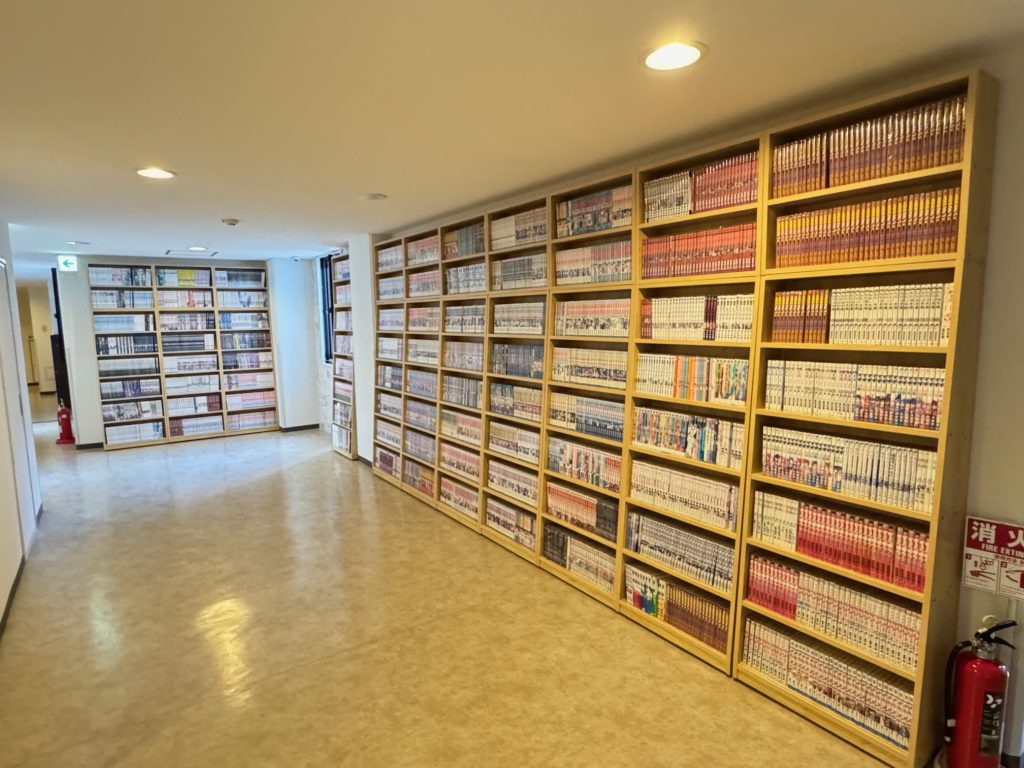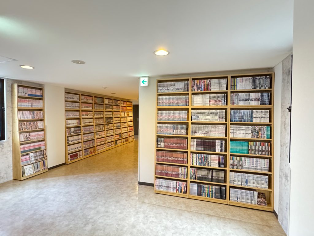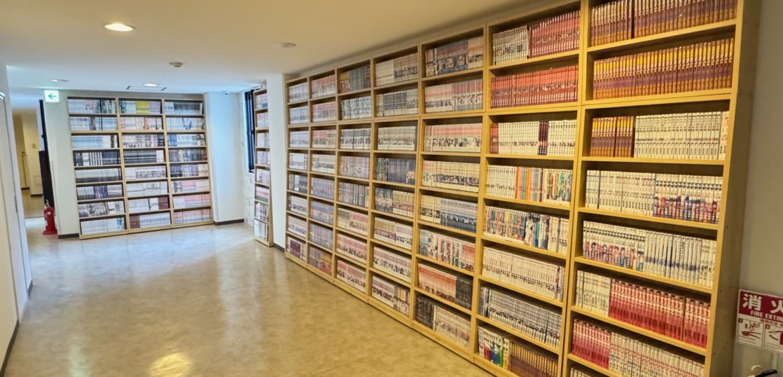 設置スペースの確認にお伺いしたところ、新館と旧館の接続廊下部分に約2000冊のコミックが設置されておりました。