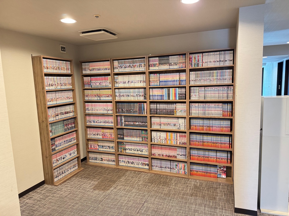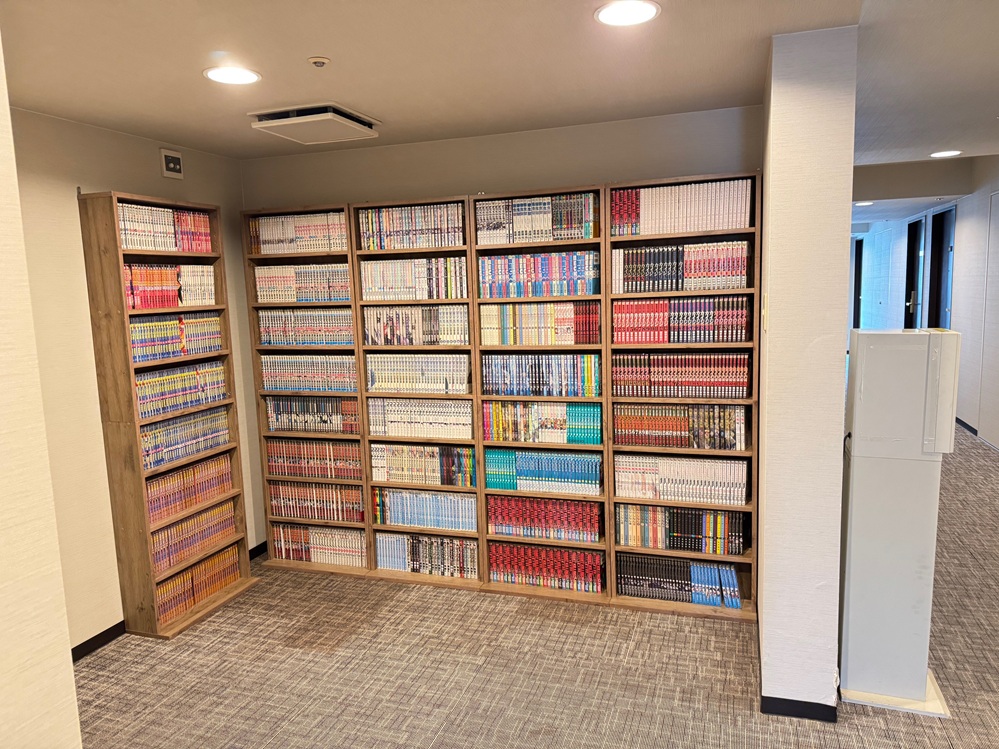 確認したところ、1箇所にまとめて4000冊ほどのコミックを設置可能なスペースがありませんでしたが、エレベーターホール横に自販機が設置されているスペースがあり、支配人様が「自販機を撤去してでも本棚を設置したい」とのお考えであったことから、自販機を撤去し、空いたスペースに8段本棚を5台設置し、それを禁煙フロアの3フロアに設置することで4200冊での設置にてご提案とさせていただきましたところ、ご満足いただき正式にご依頼いただくこととなりました。